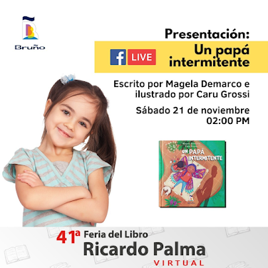El sábado 21 de noviembre voy a acompañar desde la virtualidad a Magela Demarco y a Caru Grossi en la Feria del Libro Ricardo Palma, presentando "Un papá intermitente", el libro que publicó la Editorial Bruño de Perú.